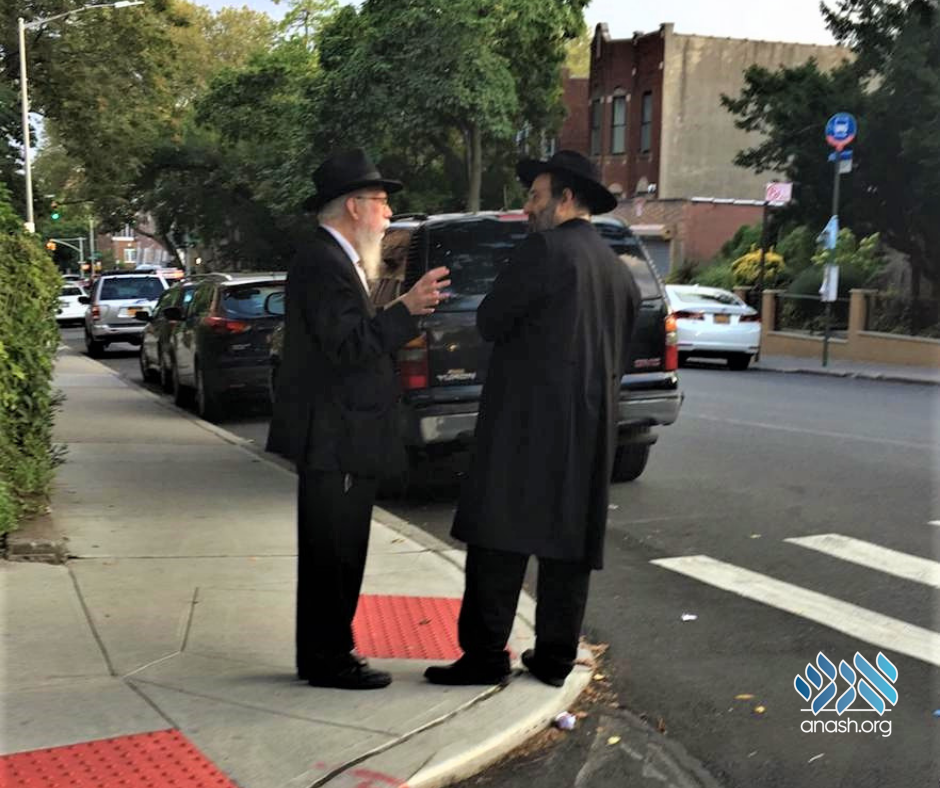 Rav Yosef Yeshaya Braun, member of Crown Heights Badatz, and Rabbi Berel Levertov, head of the Crown Heights kashrus, talk on a street corner.