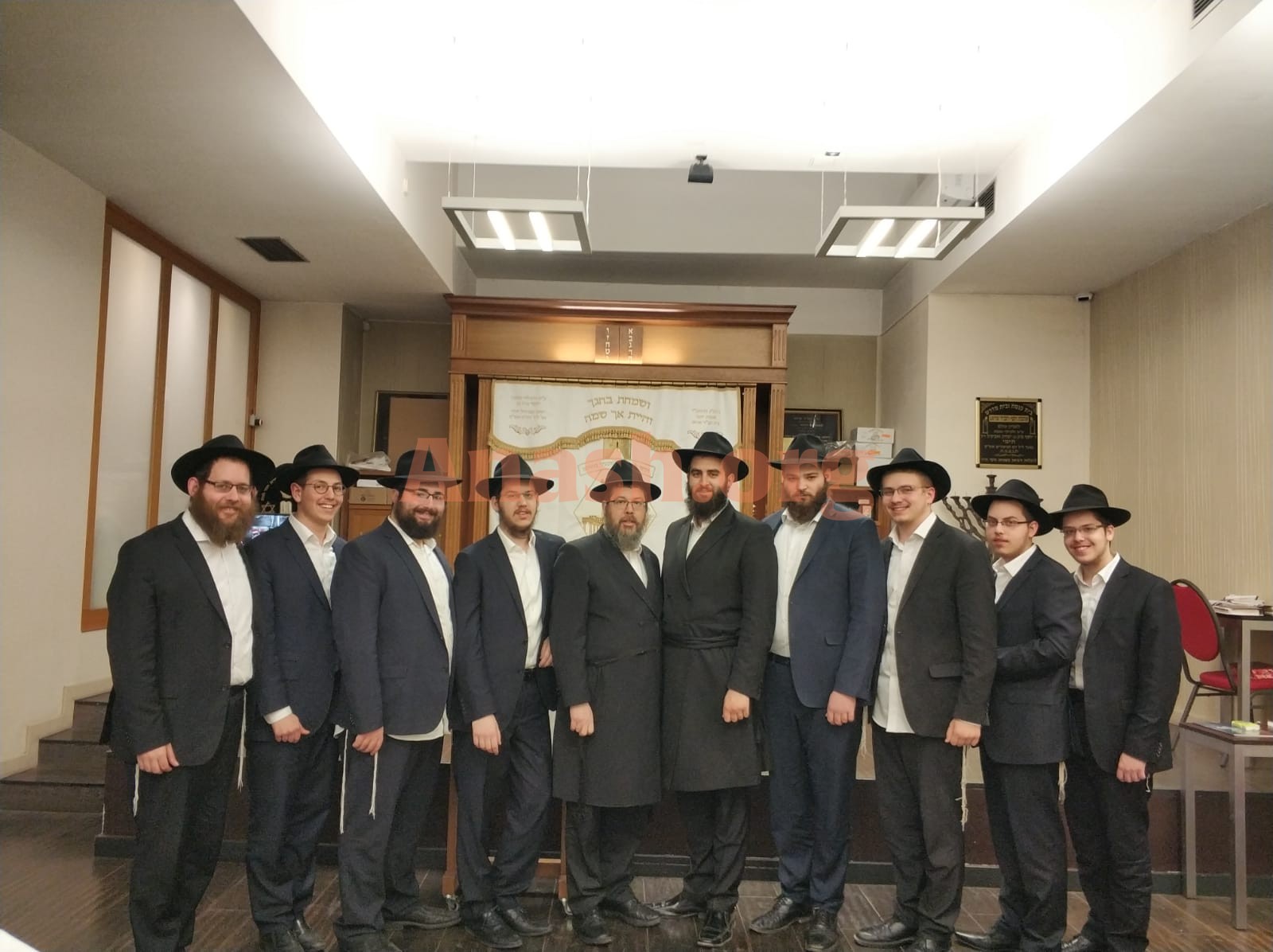 A group of bochurim on Merkos Shlichus pose with Rabbi Manis Barash, shliach to Prague, after successfully leading several community Sedorim.