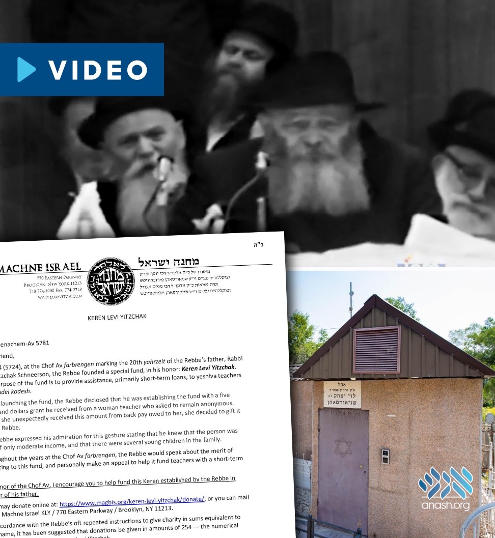 Keren Levi Yitzchak was founded by the Rebbe in 1964, at the Chof Av farbrengen marking the 20th yahrzeit of the Rebbe’s father, Rabbi Levi Yitzchak Schneerson. The Rebbe announced that the purpose of the fund is to provide assistance, primarily short term loans, to yeshiva teachers.