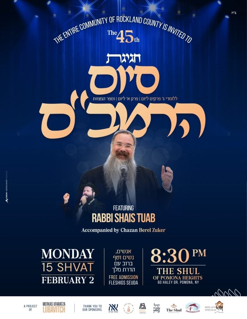 The siyum will be held on Monday evening, 15 Shvat (February 2), at 8:30 PM, at The Shul of Pomona Heights, located at 60 Haley Drive, Pomona, NY.