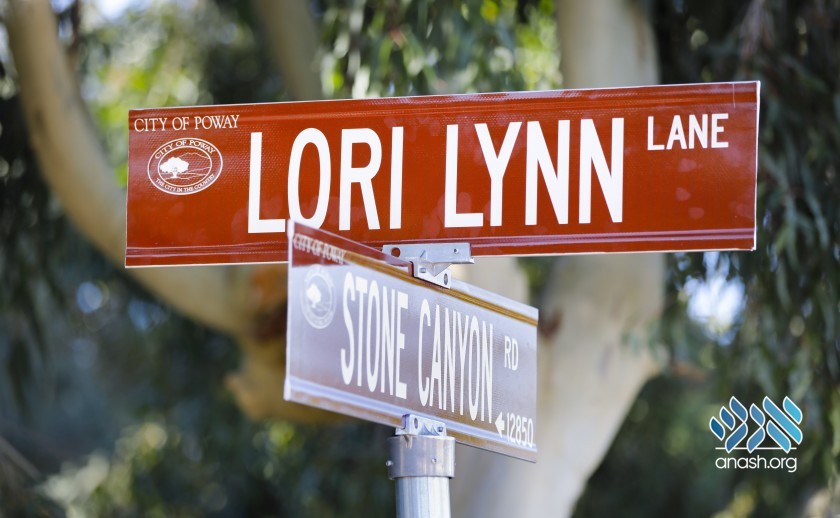 Lori Lynn Lane was dedicated on Friday and the unveiling was attended by a few dozen people, including Poway Mayor Steve Vaus, who addressed the small crowd. “It’s somehow appropriate that we gather here just before Chanuka, the Festival of Lights,” he said, “because Lori was a bright and shining light. The name of the holiday comes from the Hebrew word for dedication. So it’s fitting that we gather here to dedicate this street in memory of Lori, her life and truly her light.”