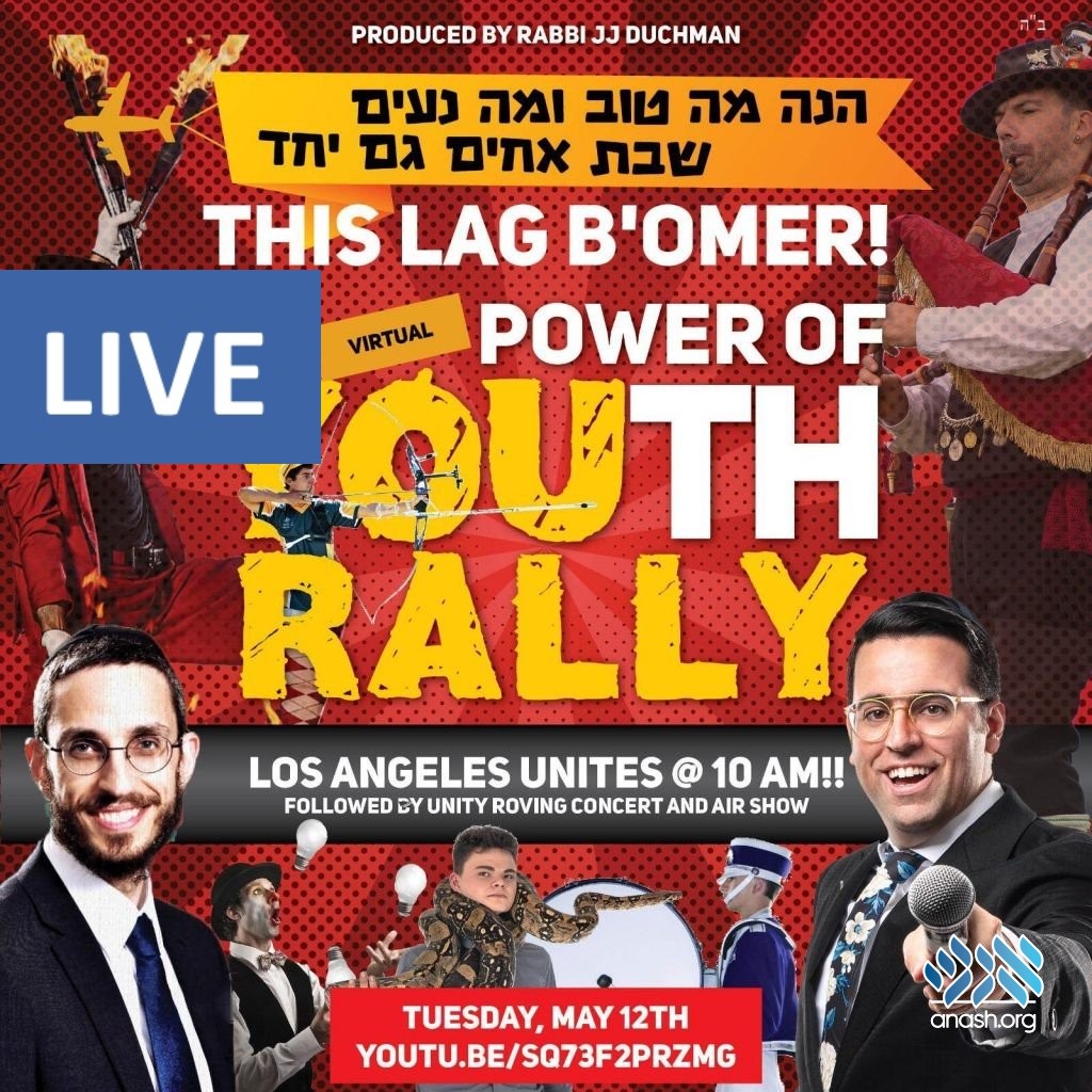 Join live at 1 PM ET: Join a Power of Youth Online Rally in Los Angeles, CA celebrating Jewish unity with singers Simcha Friedman and Uri Davidi and a juggling show, followed by an airshow and 8th Day concert.