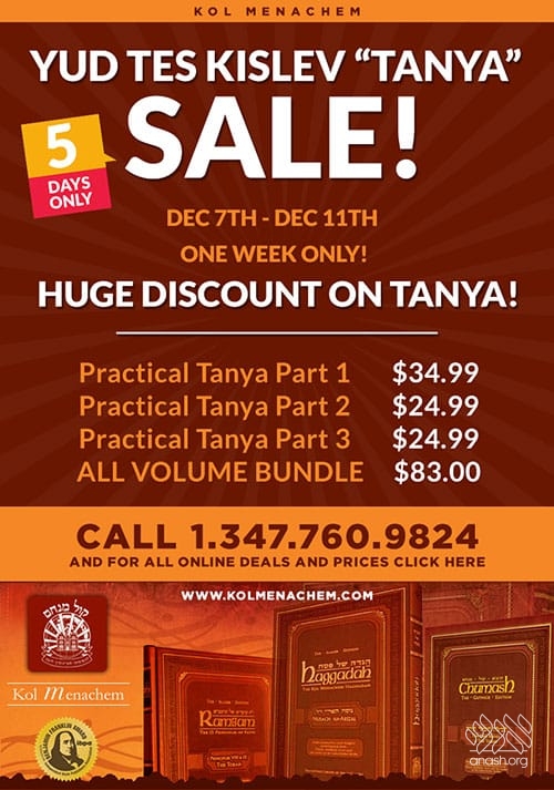 The Yud Tes Kislev sale runs for one week only. Orders can be placed by calling 1.347.760.9824 or visiting kolmenachem.com.