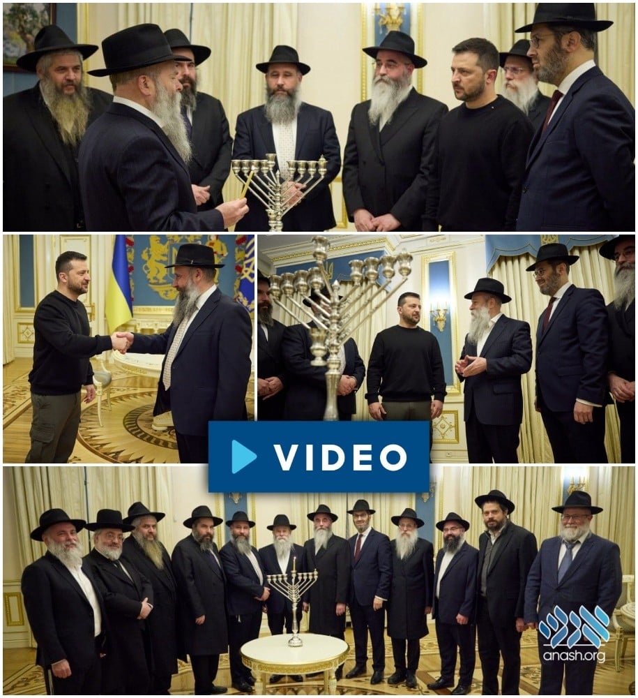Ukrainian President Volodymyr Zelensky lit the first Chanukah candle in his office on Thursday evening alongside Chabad shluchim who also serve as rabbis in various Ukrainian cities. The initiative for the meeting and lighting came from the Federation of Jewish Communities in Ukraine (FJCU), led by Chabad shliach Rabbi Meir Stambler.