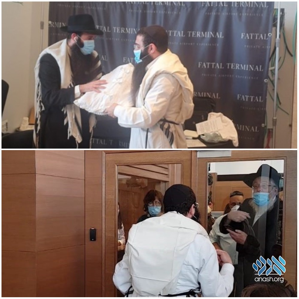 The Bris for the six-weeks-old son of Shluchim to Limassol, Cypress, Rabbi Yair and Geula Baitz, took place today in the international arrivals terminal of Ben Gurion airport.