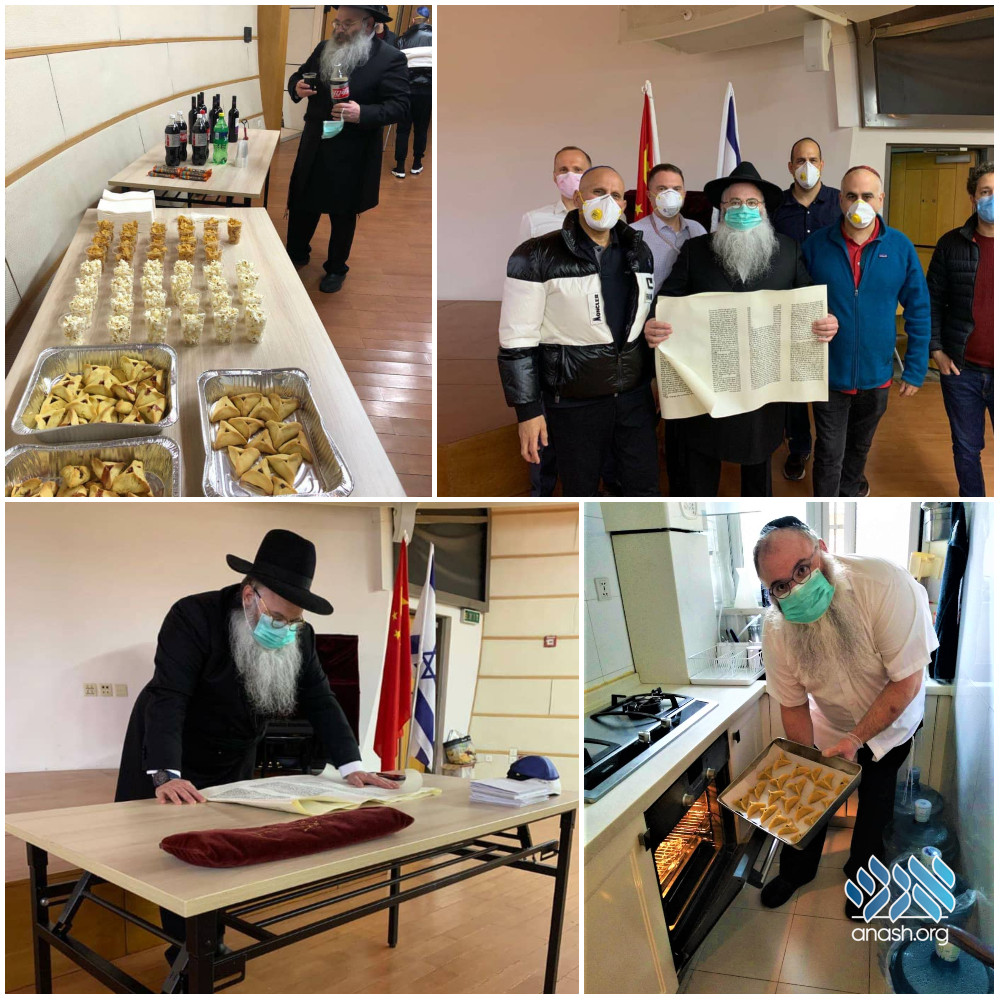 Shliach to Beijing Rabbi Shimon Freundlich, who remained in China despite the outbreak, read the Megillah at the Israeli embassy in Beijing, for and local residents and embassy staff. After the Megillah reading, the assembled enjoyed freshly baked Hamantashen prepared by the rabbi himself.
