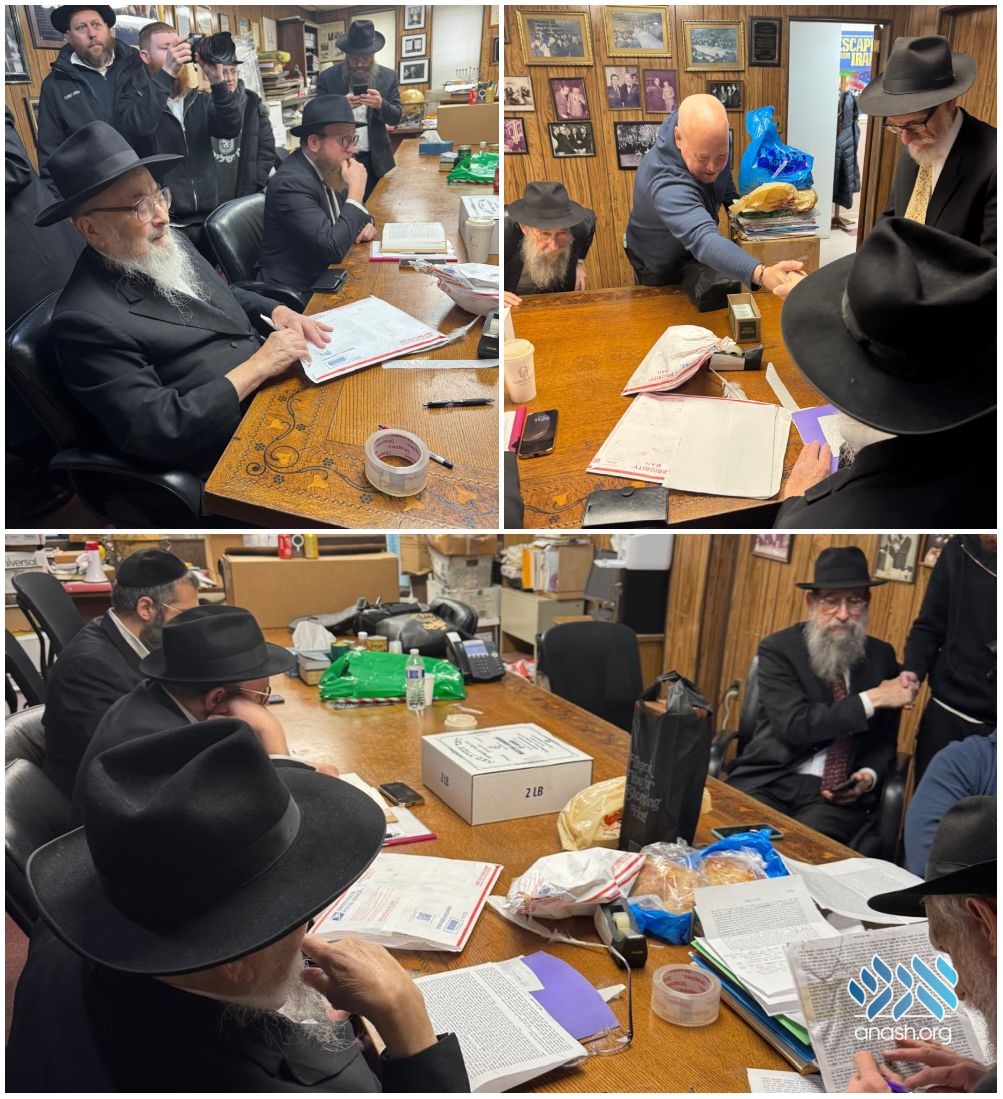 Rabbi Moshe Bogomilsky, joined by Rabbis Shimon Hecht, Mordechai Zev Hecht, Sholom Ber Shuchat, and Yosef Yitzchok Holtzman, sells chometz at NCFJE in Crown Heights.