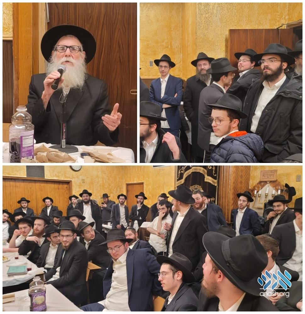 On Motzei Shabbos, Rabbi Cunin led his customary farbrengen, with a large crowd of bochurim joining to listen and be inspired.
