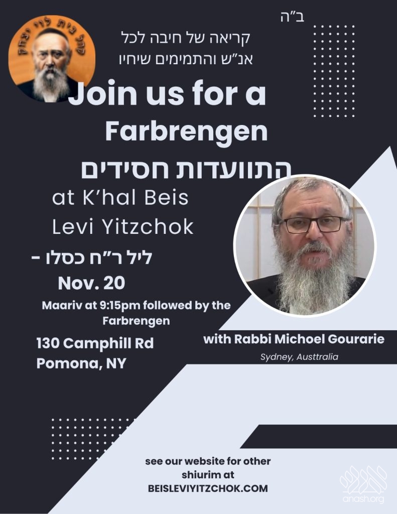 Rabbi Michoel Gourarie, shliach and mechanech in Sydney, Australia, led a Rosh Chodesh Kislev farbrengen at Bais Levy Yitzchak of Pomona, NY, where he shared uplifting stories of hiskashrus and shlichus.