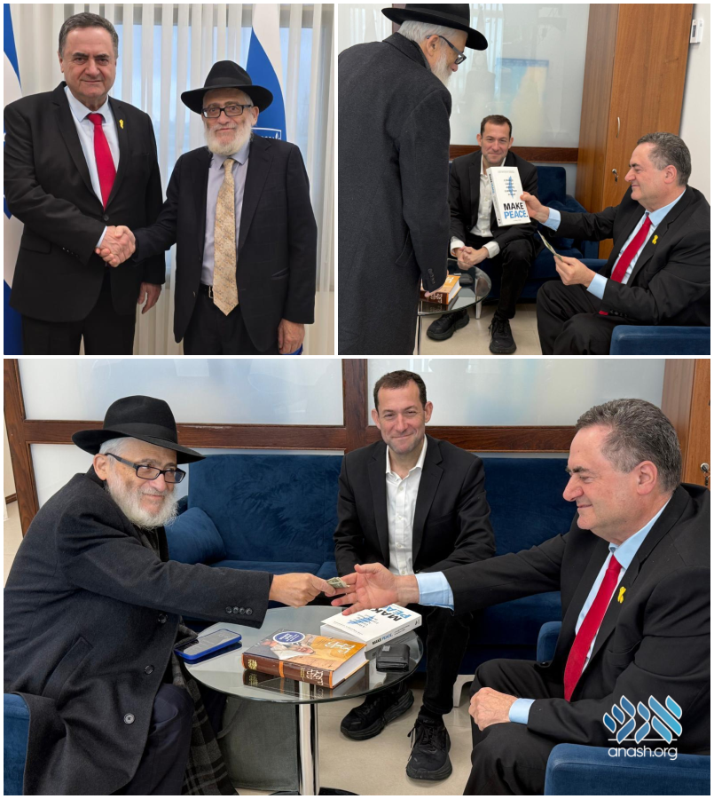 Rabbi Yossel Gutnick, shliach of the Rebbe for Shleimus Haaretz, met with Israel’s new Minister of Defense, Yisrael Katz, conveying to him the Rebbe’s stance on Eretz Yisroel’s security and gifted him dollars from the Rebbe, as well as Hebrew and English books of the Rebbe’s view.