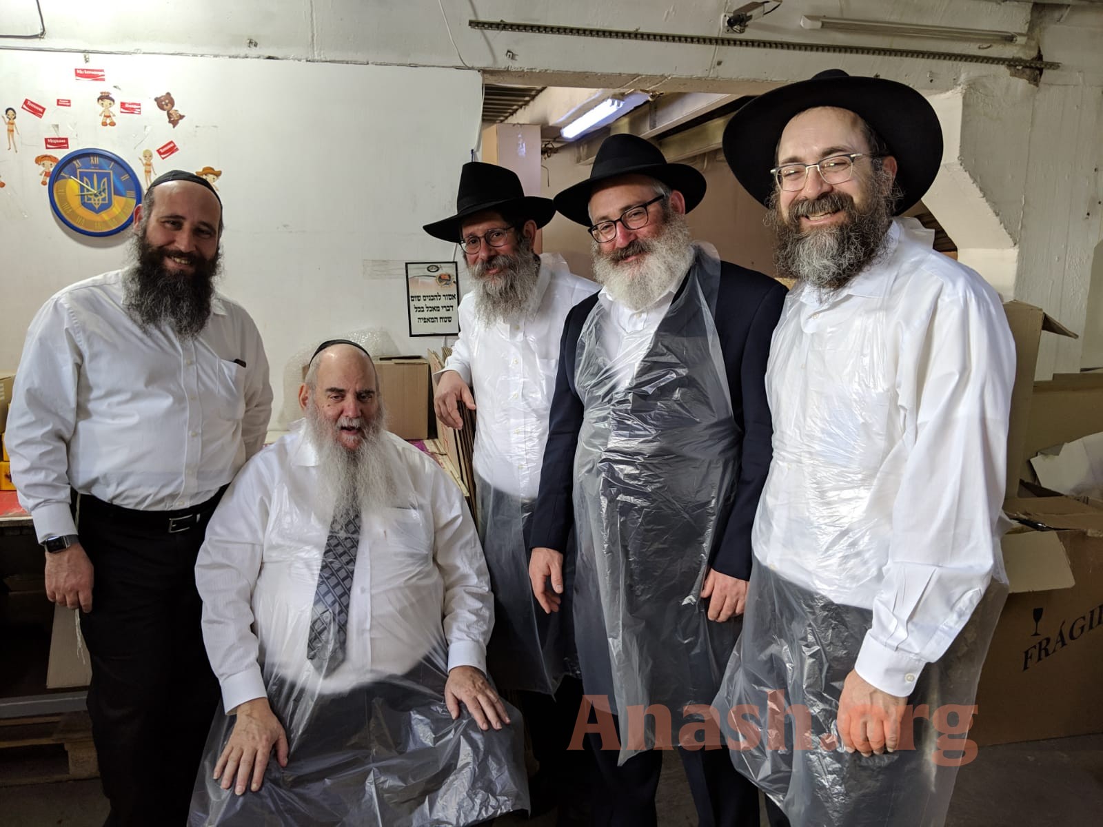 Rabbi Moshe Kotlarsky and other shluchim in Dnepropetrovsk for the Lerman-Kaminetzki wedding, visit the Ukraine Matza bakery.