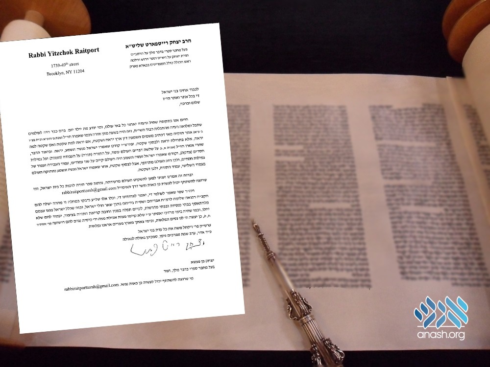 Rosh Kollel Rabbi Yitzchok Raitport, mechaber seforim and supporter of Oholei Torah and Bais Rivka, announced the initiation of a new Sefer Torah, written in the merit of Klal Yisrael.