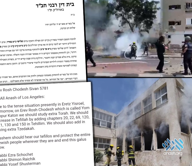The Beis Din Rabbonei Chabad of Eretz Yisroel also called for a day of tefillah, asking Anash around the world to recite extra Tehillim for the safety of our brethren living in Eretz Yisroel.