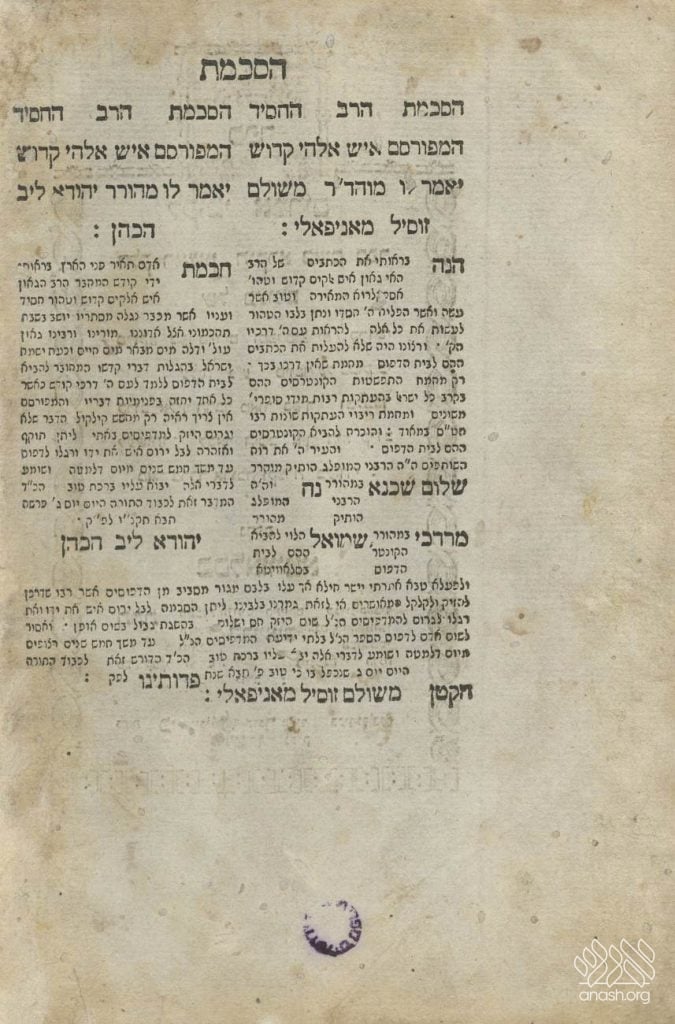 The edition was published by Harav Shalom Shachna, son-in-law of the Alter Rebbe and father of the Tzemach Tzedek, together with his partner. The present copy bears a signature reading, “the worker… Elazar son of Reb Tzvi Hirsch of Slavita,” while other known copies of the first edition carry the signature of a different typesetter, Avraham Tzvi son of Reb Eliezer Katz.