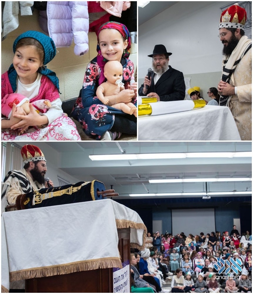 The auditorium was decorated to have a resemblance of the Beis Hamikdosh. Many students were dressed “like in the times of the Beis Hamikdosh”. Each grade was assigned a costume to wear representing the concept of “anoshim, noshim v’taf“. There were mommies, taties, bubbies, zaidies, Sanhedrin and their wives, the Royal Family, Kohanim, Leviim, and even visitors from outside of Eretz Yisroel.