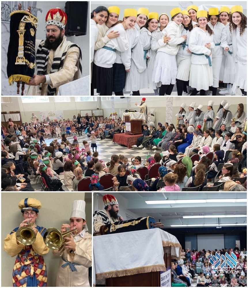 The auditorium was decorated to have a resemblance of the Beis Hamikdosh. Many students were dressed “like in the times of the Beis Hamikdosh”. Each grade was assigned a costume to wear representing the concept of “anoshim, noshim v’taf“. There were mommies, taties, bubbies, zaidies, Sanhedrin and their wives, the Royal Family, Kohanim, Leviim, and even visitors from outside of Eretz Yisroel.