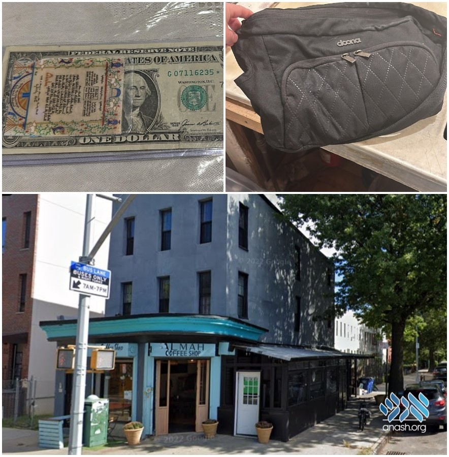 If you or someone you know may have left behind a bag containing a dollar and Shir Hamalos at Almah Caffe, please visit the café at 87 Utica Ave, Brooklyn, NY 11213, or call Moshe at 323-622-5714 with identifying details.