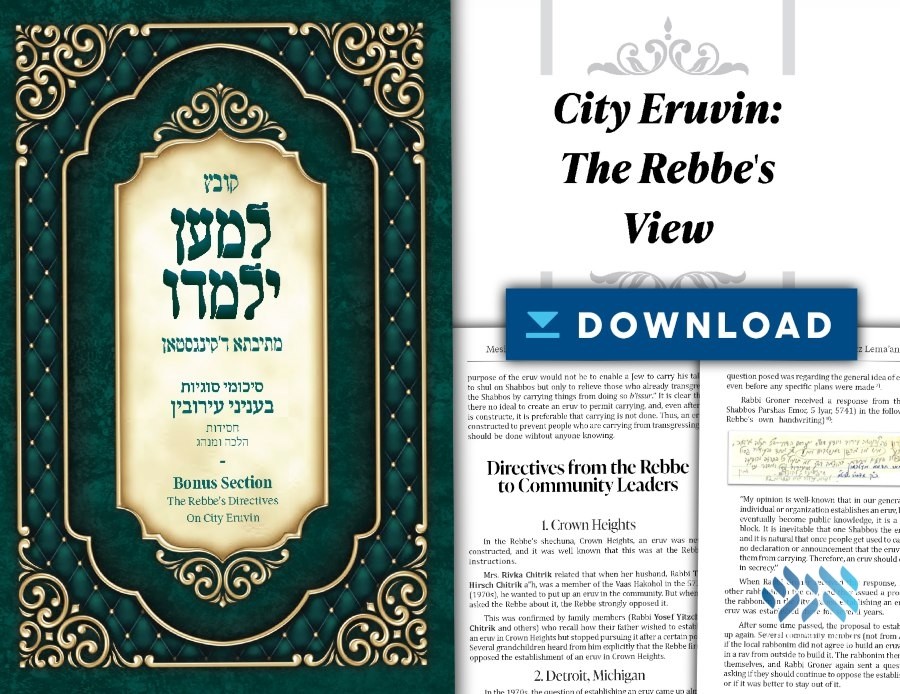 Click here to download the Rebbe’s View on City Eruvin in English.