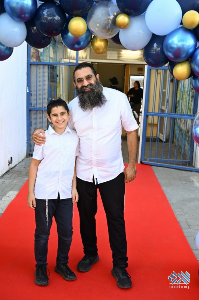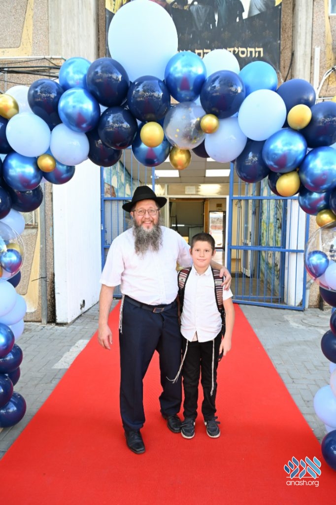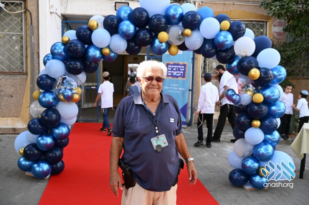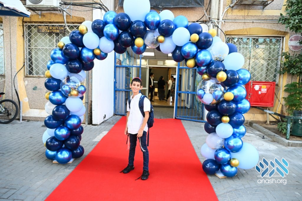 The entrance of the Cheder – and even the surrounding street – was decorated with colorful helium balloons. Standing at the gates, Rabbi Amir Hertz, the menahel, together with his assistant Rabbi Mendy Elbaz, received every child and parent with a smile. Families paused for pictures at the beautiful “balloon arch” before heading inside, where the boys met their new melamdim.