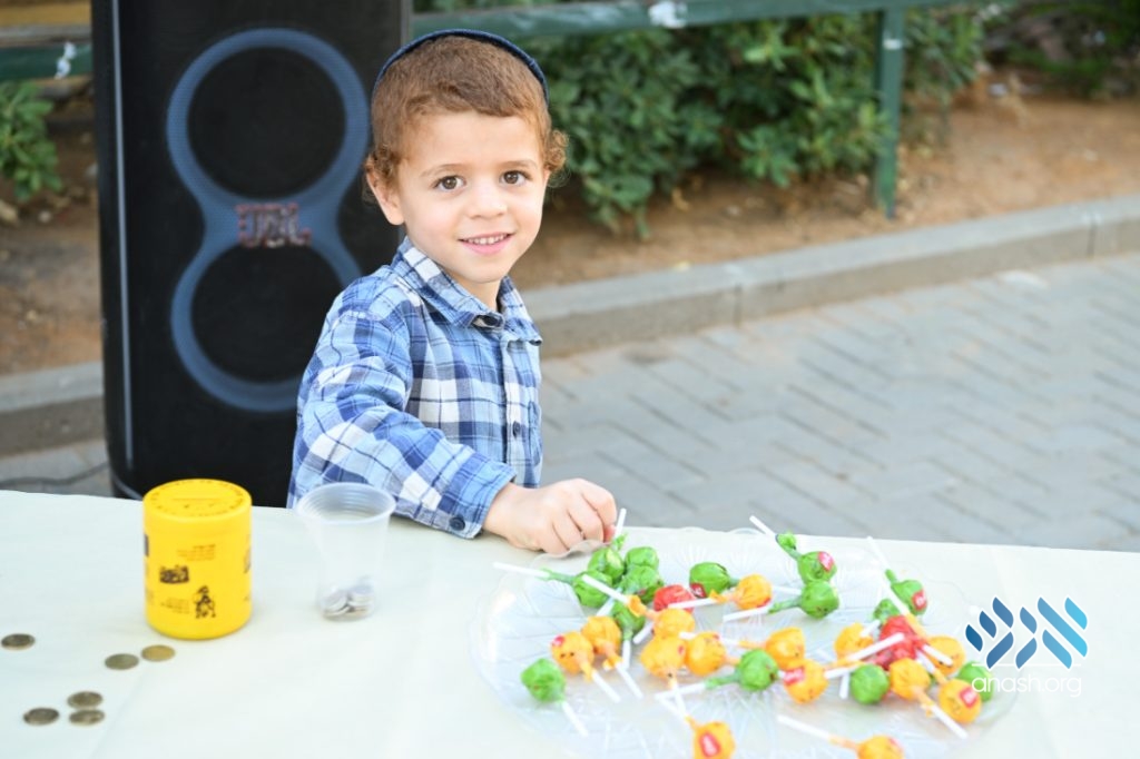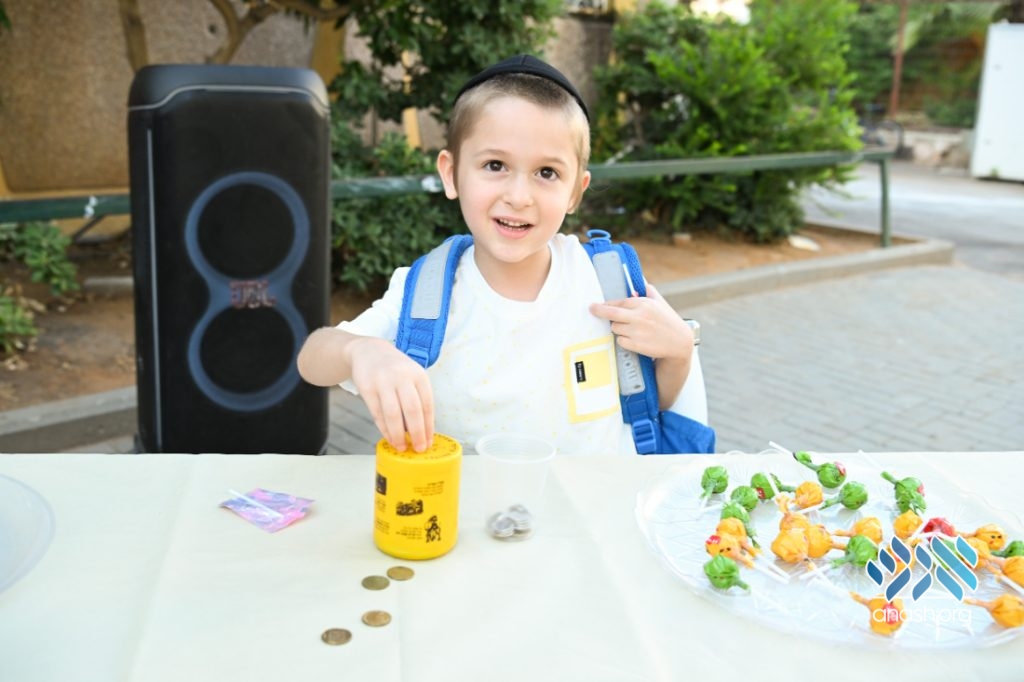 Upon arrival, hundreds of children and parents were greeted with a sweet treat in honor of the new school year and given coins for tzedaka, while joyous niggunim played in the background.