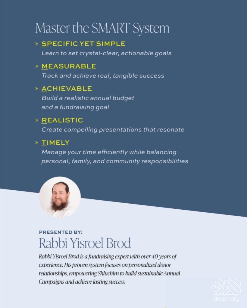 Visit shluchim.org/brodseminar to register and take your first step toward building a successful annual fundraising program.