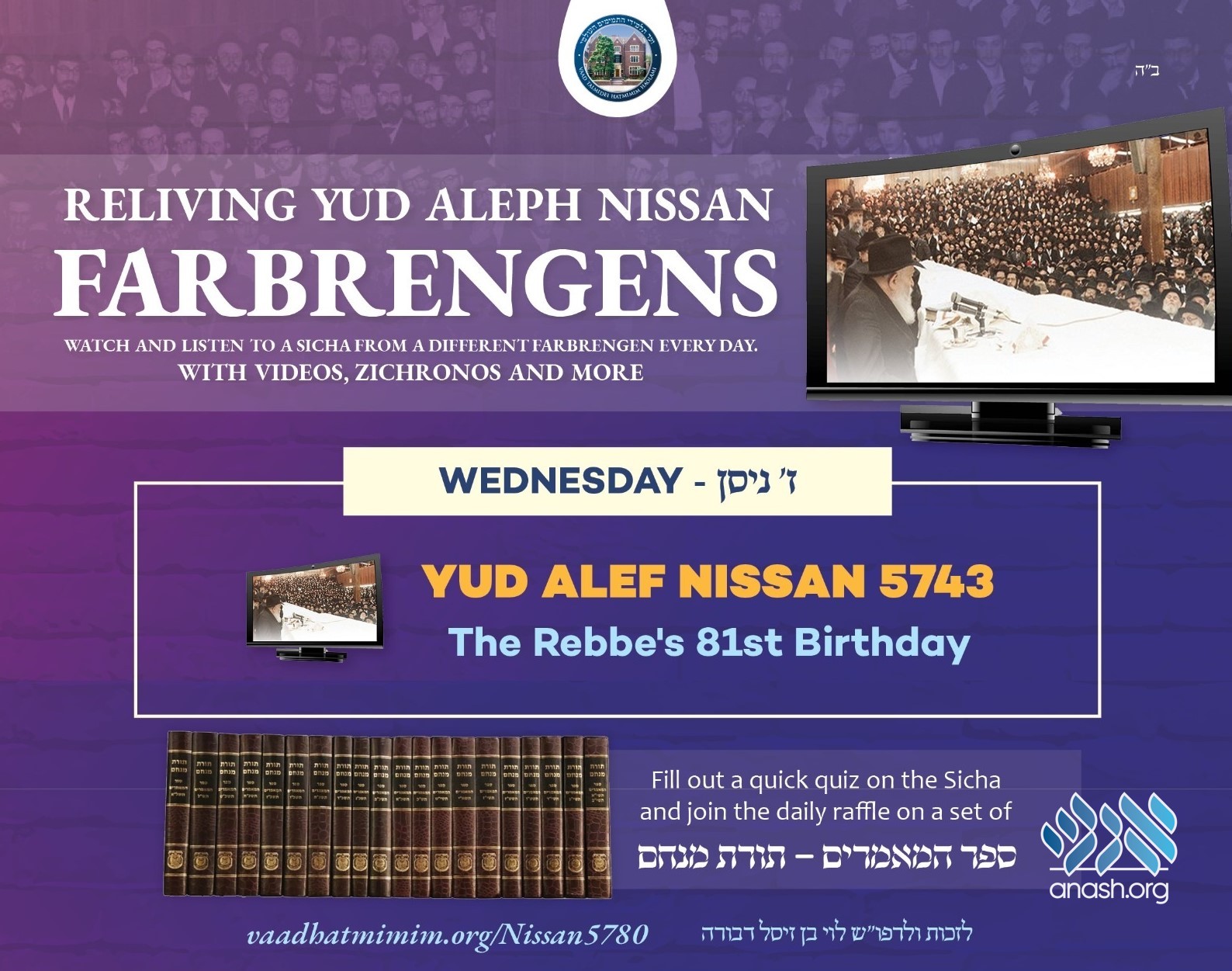 Fill out the quick quiz on the Sicha and enter into today’s raffle on a set of ספר המאמרים – תורת מנחם. Deadline: Thursday, 8 Nissan, 6:00 PM.