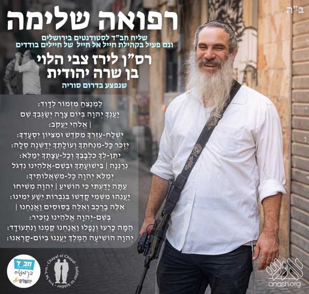 Rabbi Liraz Zeira, a shliach on Campus in the Nachlaot neighborhood of Yerushalayim and a Major in the IDF reserves, was critically injured in a blast near an army post in Syria.
