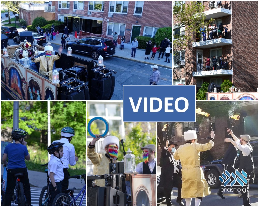 The challenge of course was how to reach as many people as possible, and yet be as safe as possible? So Rabbi Levi and Sarah Shemtov, Shluchim of the Rebbe to Riverdale and the Bronx, hired a music truck and a fire juggler that would enable children to hear and see the simcha from the safety of their buildings.