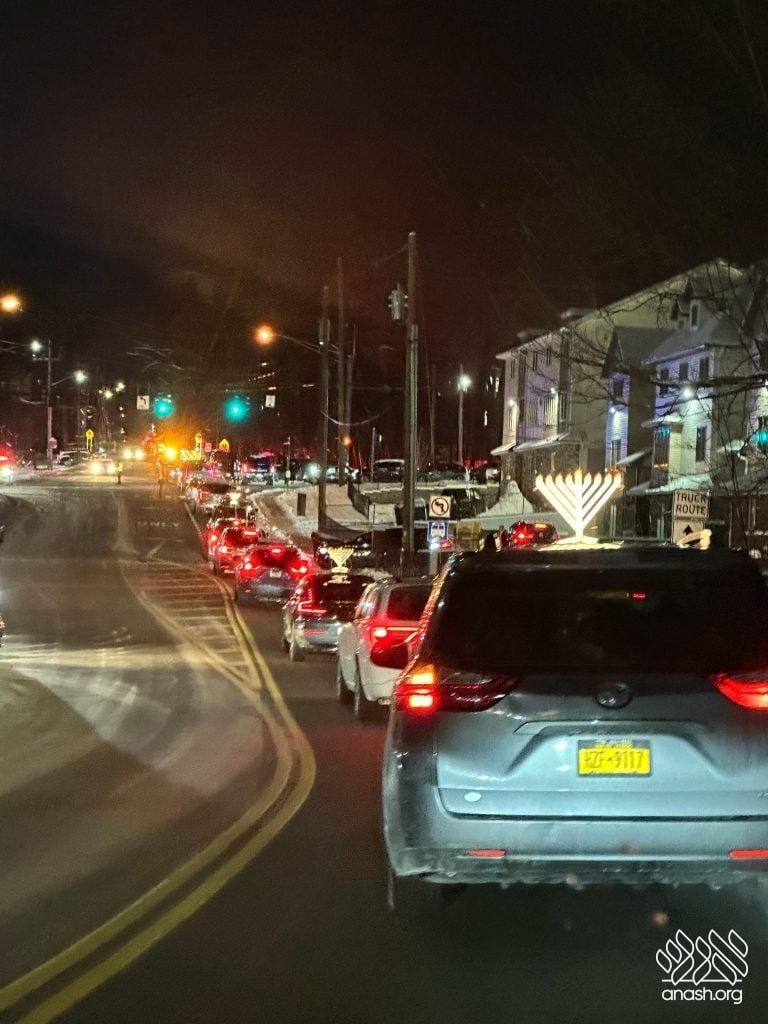 The parade, organized by talmidim hashluchim to Mesivta Lubavitch Monsey, together with the bochurim in yeshiva, began at the Tzemach Tzedek Anash Shul, where all the cars lined up. Those who didn’t yet have menorahs on their cars were helped to set them up and assemble them on the cars before the parade officially departed at 7:15 PM.