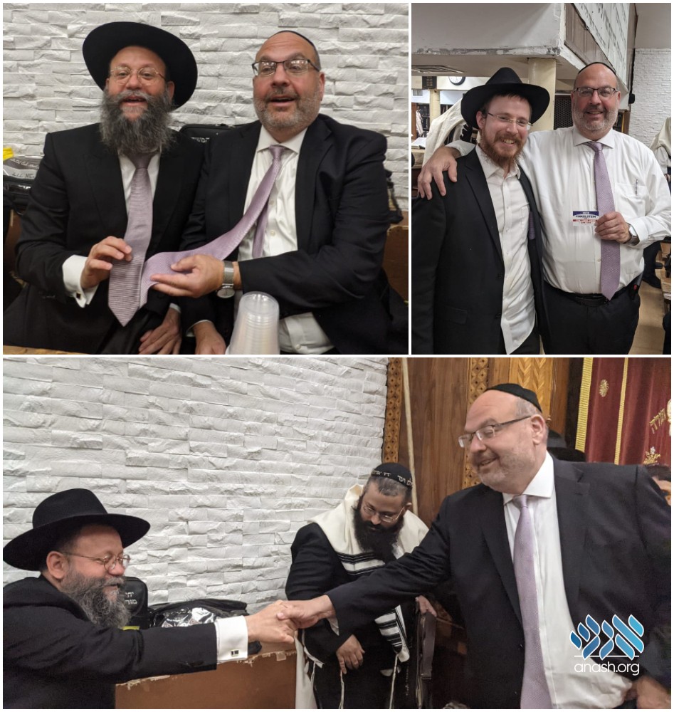 The rov and candidate said l’chaim together and shared some words of Torah. A humorous moment was when a bystander pointed out that they were wearing matching ties, and the two posed for a picture holding them.