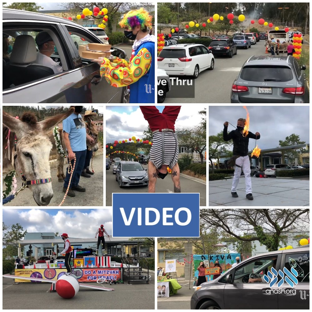 Chabad Hebrew Academy of S. Diego offered its community a Lag B’Omer Drive-Thru Circus Experience, setting up multiple stages in their school parking lot. Thousands of patrons slowly drove through in their cars. They were greeted by arches of red and yellow balloons (representing flames) Chasidic music, stilt-walkers, unicyclists, acrobats, jugglers, hula hoops, puppets, and clowns.