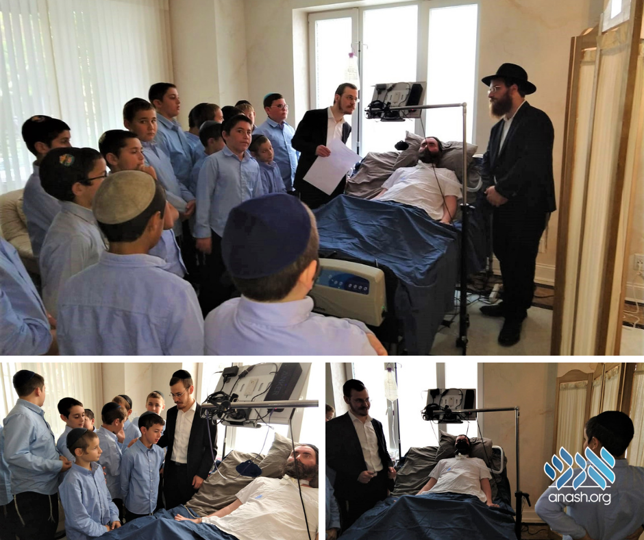 Thursday, Hei Elul, grades 5 and 6 of United Lubavitch Yeshiva Ocean Parkway had the tremendous opportunity to visit Rabbi Yitzi Hurwitz during his visit to New York. The boys said the 12 Pesukim, sang a niggun and wished him brachos for a speedy and complete recovery.