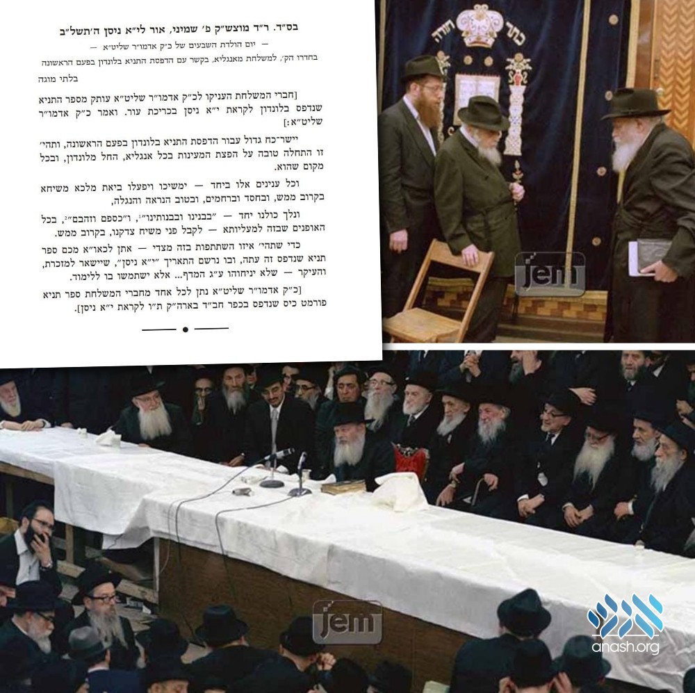 According to the yomanim from that year, Rabbi Nachman Sudak, the Rebbe’s Shliach to England, waited in Gan Eden Hatachton that Friday (9 Nissan) to gift the Rebbe a copy of the Tanya that was printed especially in England, as a tribute to the Rebbe and in line with his request to print the Tanya in every location.