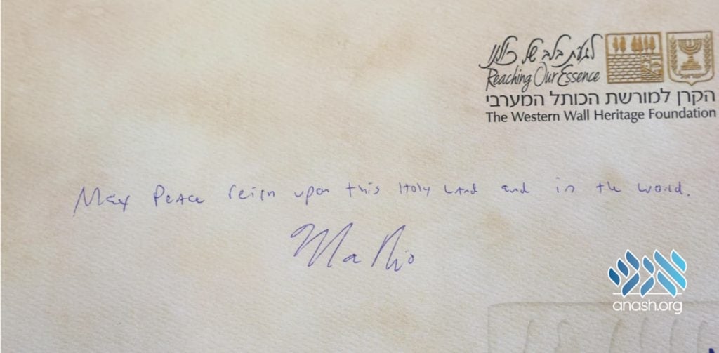 At the conclusion of the visit, Secretary Rubio signed the Kosel guest book, writing: “May peace reign upon this Holy Land and in the world.”