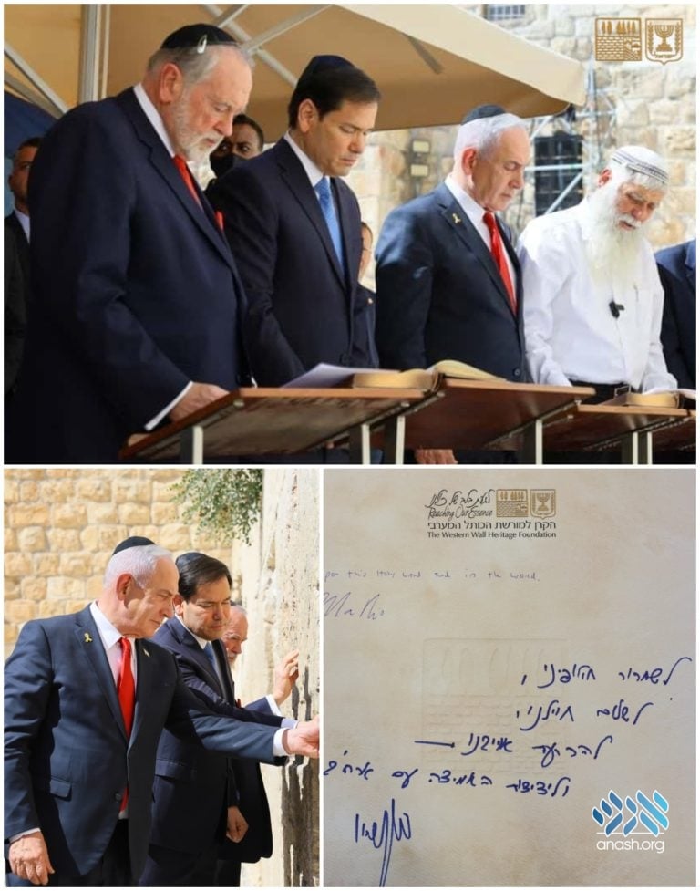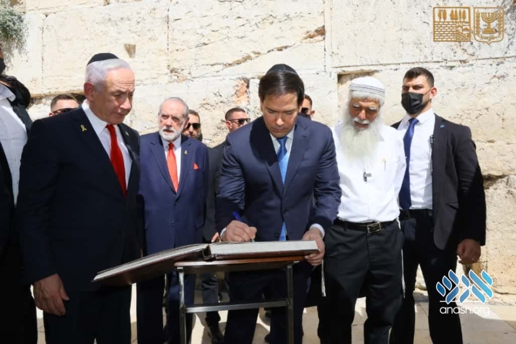 At the beginning of his official visit to Eretz Yisroel, U.S. Secretary of State Marco Rubio and his wife, Mrs. Jeanette Rubio, together with Israel’s Prime Minister Binyamin Netanyahu and his wife, Mrs. Sara Netanyahu, as well as U.S. Ambassador to Israel Mike Huckabee and his wife, Mrs. Janet Huckabee, visited and prayed at the Kosel Plaza in Yerushalayim.