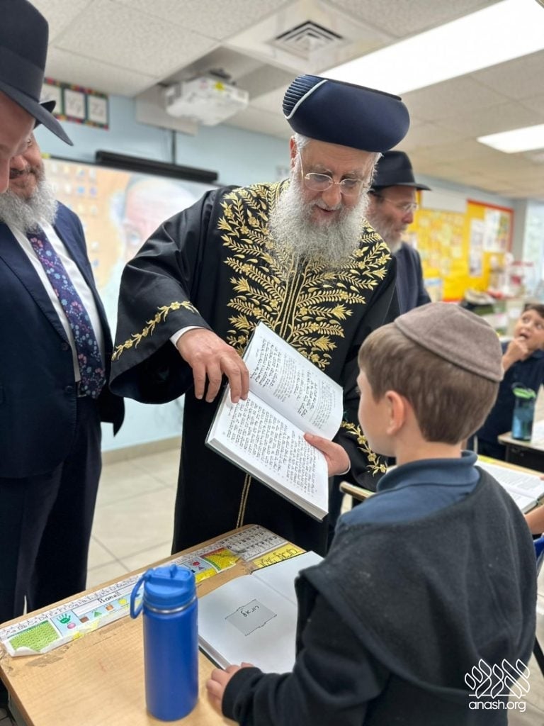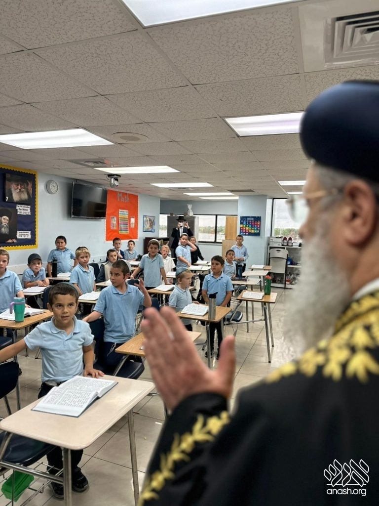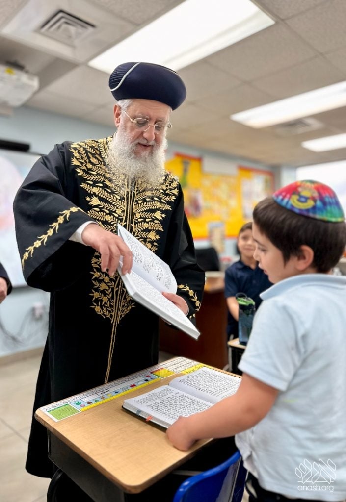 Accompanied by Rabbi Yossi Zavdi and Rabbi Mendy Cass of LEC, Rabbi Chay Amar of Chabad of Golden Beach, and Rabbi Yosef Galimidi of the Edmund Safra Synagogue, Rabbi Yosef toured some of the classrooms with Boys Elementary School Principal Rabbi Moshe Stern, interacting with the students and asking them questions on what they were learning. The younger boys practiced their kriyah skills and read from their siddurim and the older boys shared what they were currently studying for the Chidon Sefer Hamitzvos.