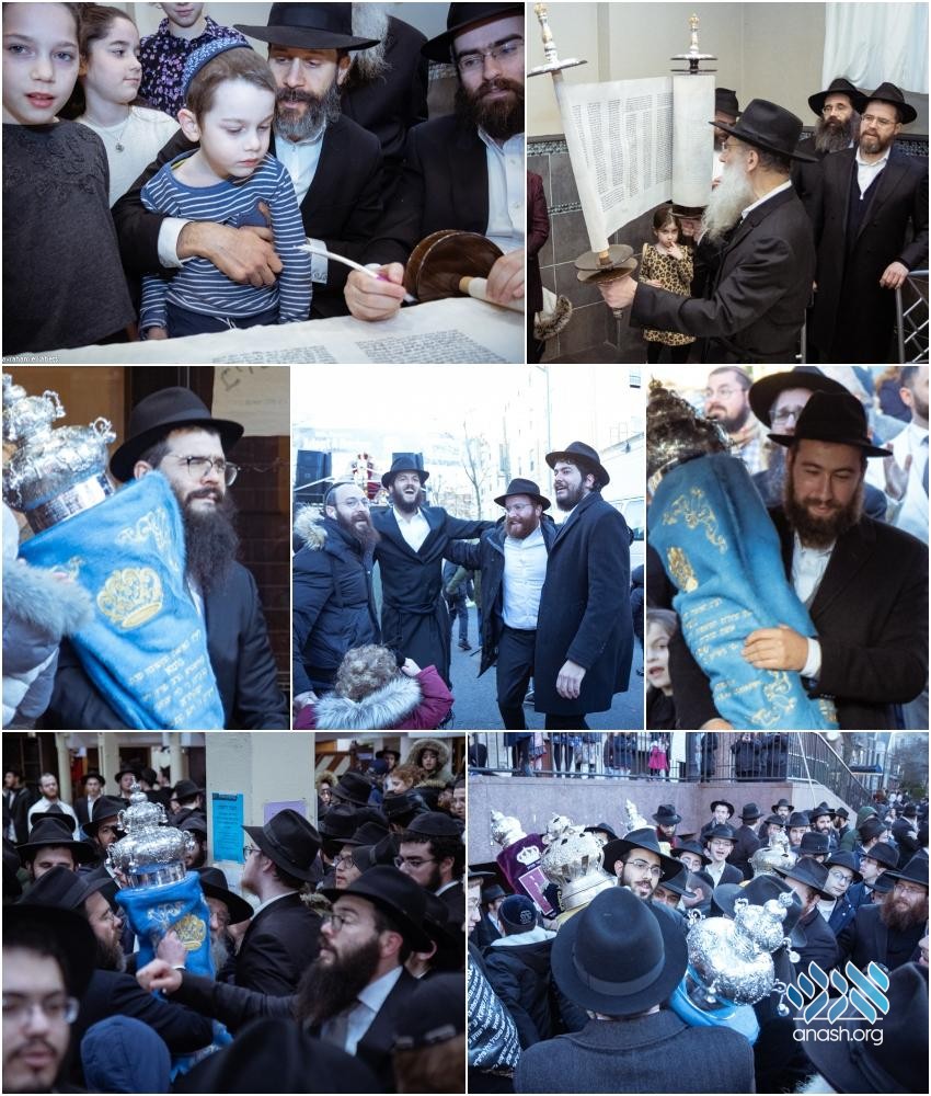 Friends and family gathered at Lubavitch Yeshiva Hall to write the final letters in the new Sefer Torah. The siyum was followed by a parade to 770 and hakafos at 770 Eastern Parkway.