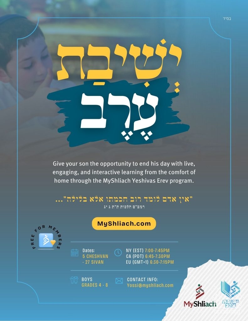 Yeshivas Erev runs nightly Monday through Thursday, and is open for boys in Grades 4-8.
