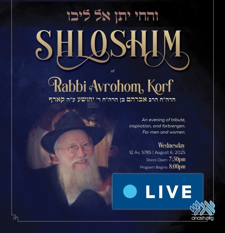 Live tonight at 8:00 PM ET: The Florida Jewish community and chassidim everywhere will mark the shloshim of Rabbi Avrohom Korf, a”h, with an evening of tribute and inspiration. The event will be streamed live on Anash.org.