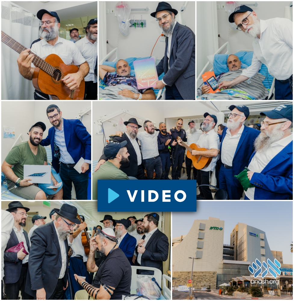 The delegation of 28 shluchim visited civilians and soldiers who were injured over the past weeks at the Soroka Hospital in Be’er Sheva, bringing them gifts, cards, tefillin and singing with them.