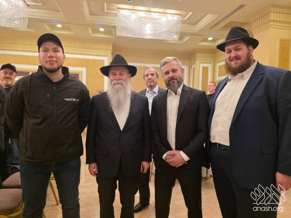 Welcoming the shluchim at the hotel entrance were Shliach Rabbi Shmuel Kamintzky, Rabbi Reuven Kamintzky from the Shabbos Achdus Committee, Rabbi Shlomo Salmon from Kremenchuk, Shliach Rabbi Shmuel Levenhartz from JRNU, and members of the local community.