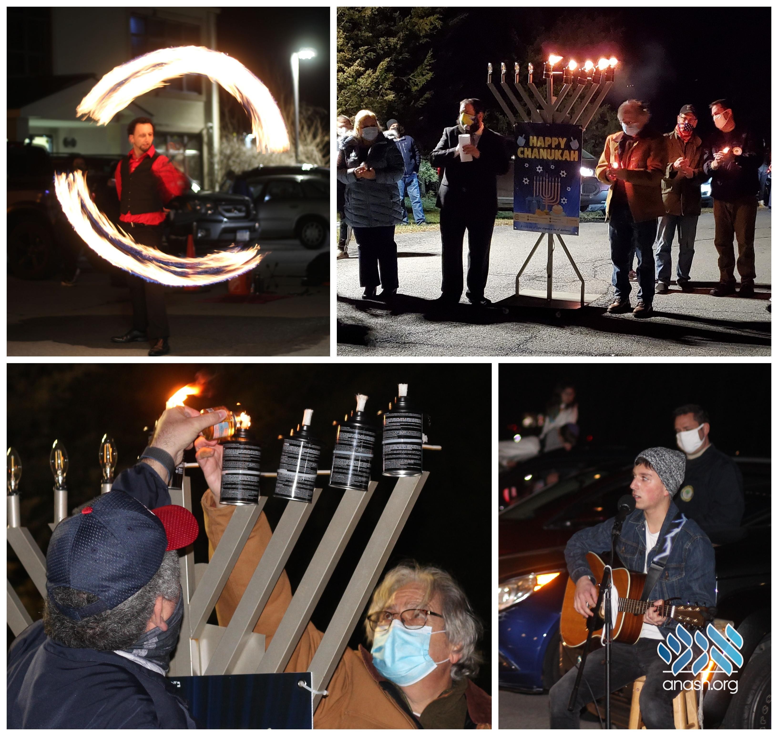 Hot latkes, hot cocoa, doughnuts, dreidels and chocolate coins, “Happy Chanukah” glow sticks, light-up menorah necklaces and more were among the treats delivered. The evening was topped off with a fire show by Ethereal Fire Entertainment.