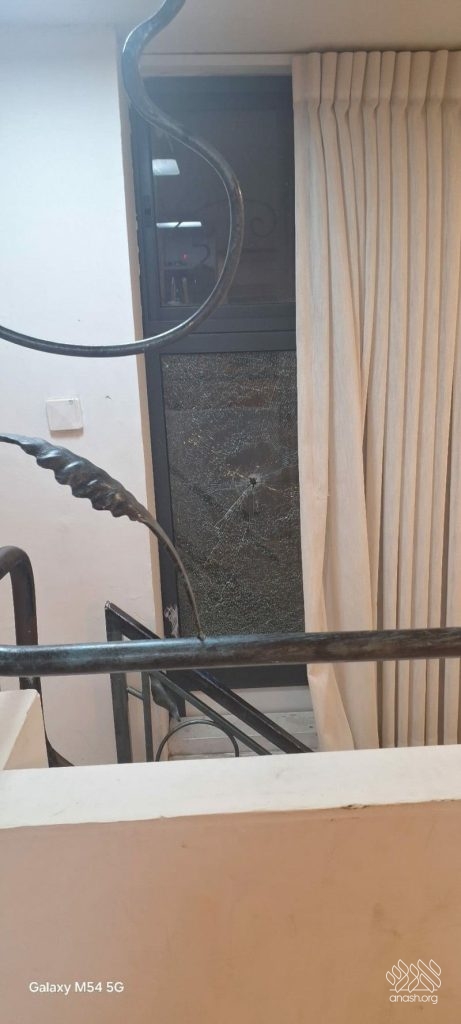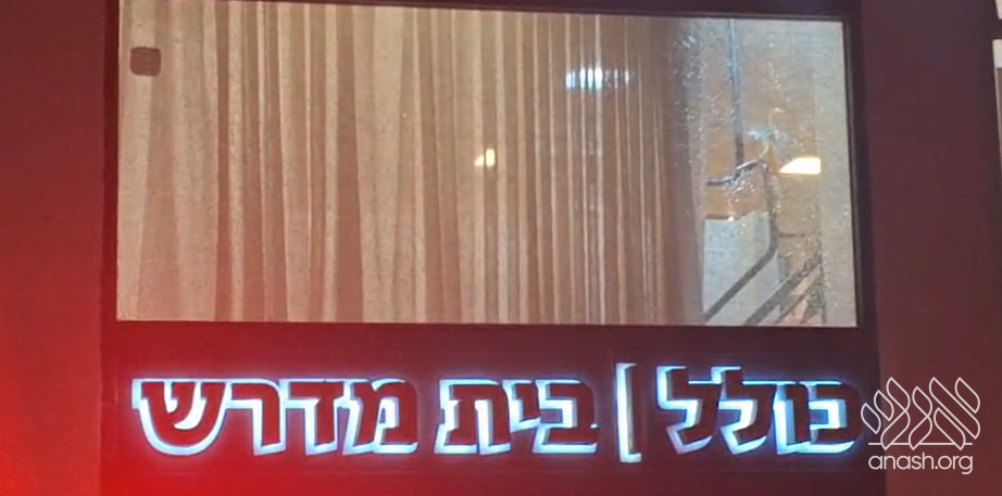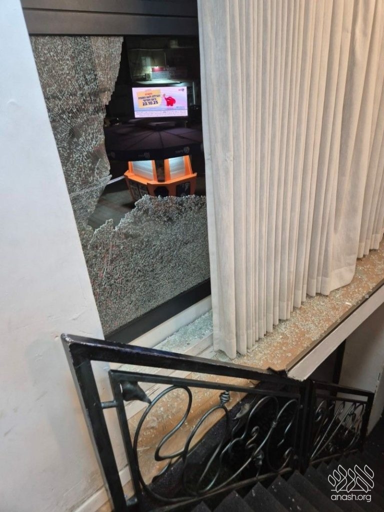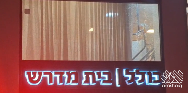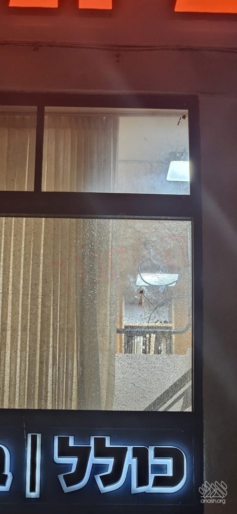The incident took place around 9:30 PM when shots were fired from a passing vehicle near the intersection of Herzl and HaNasi Streets. One bullet pierced the Chabad building, shattering a large tempered glass window of the Beis Midrash where several chavrusos were studying as part of the evening kolel.