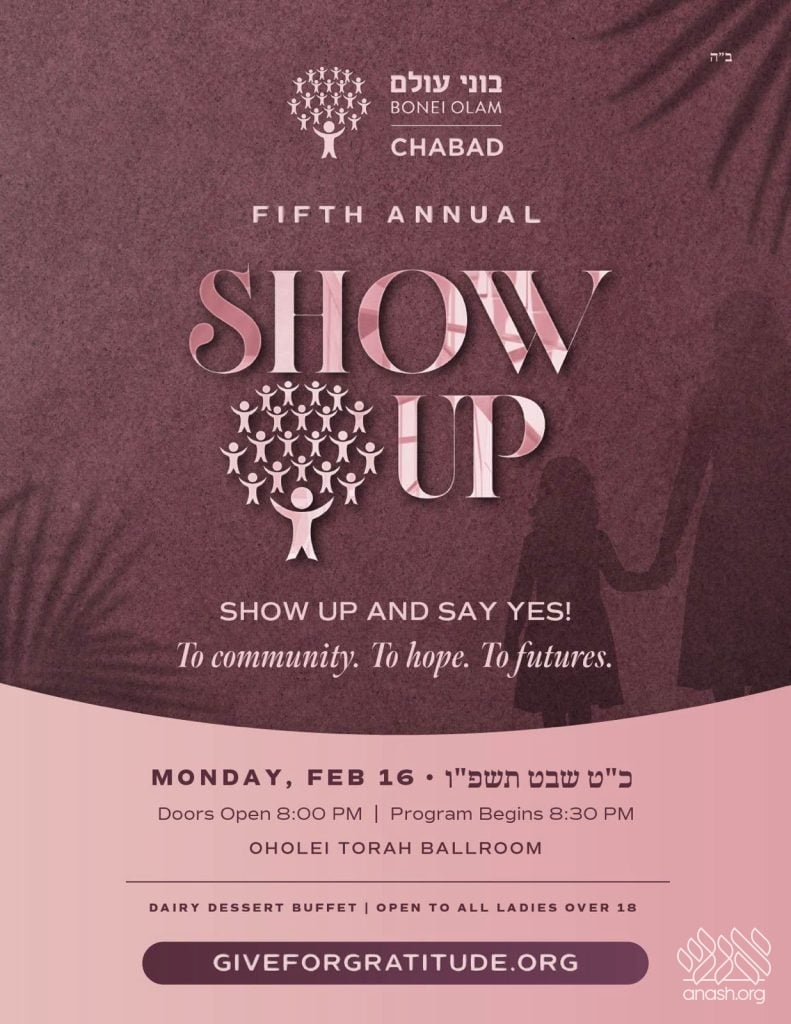 These values will be at the center of the 5th Annual Bonei Olam Chabad Women’s Show Up Event, taking place Monday evening, February 16, at Oholei Torah. Doors open at 8 pm.