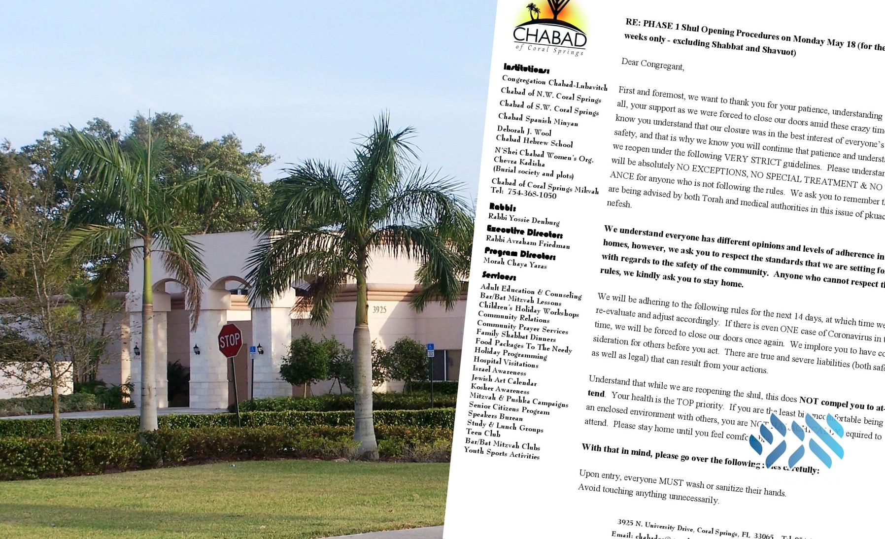 Yesterday, Chabad of Coral Springs, FL, led by Rabbi Yossie Denburg and Rabbi Avraham Friedman, issued Shul opening protocols beginning Monday, May 18, the day Florida’s full phase-one opening plan goes into effect.
