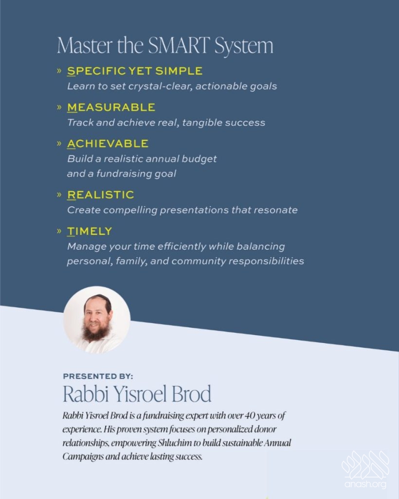 Get a head start on the Kinus and return to your Shlichus with the most practical tools to enable and empower you by joining the annual fundraising seminar with Rabbi Yisroel Brod.