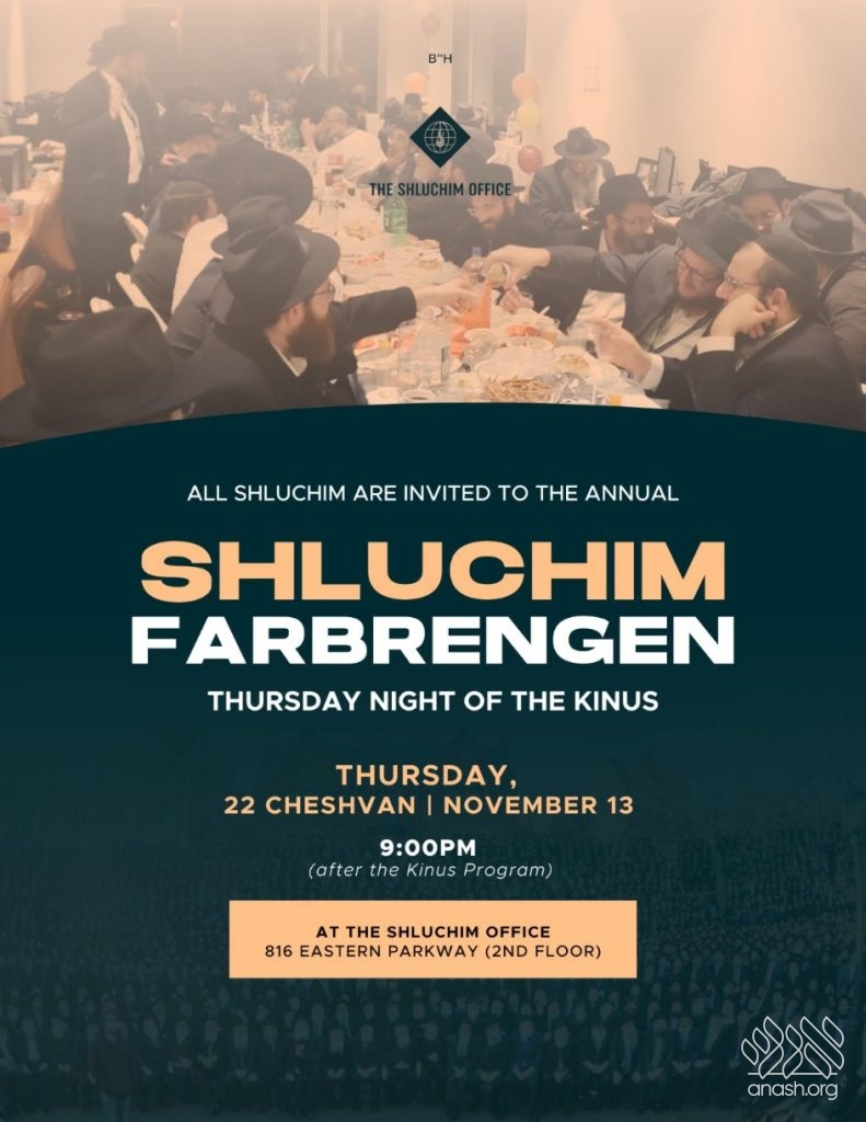 Shluchim are invited to join on Thursday night, 22 Cheshvan (November 13) after the Kinus Hashluchim program concludes for a lively and beautiful Farbrengen at the Shluchim Office.