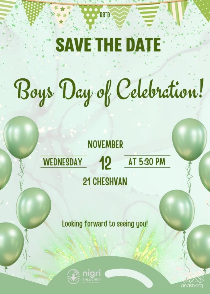 The annual Day Of Celebration for the Boys Division will be held on Wednesday, 21 Cheshvan (November 12).