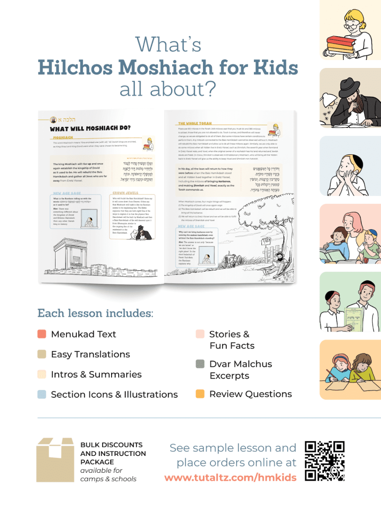A guided learning experience unpacking the Rebbe’s approach to Moshiach, Jewish leadership, and the Rambam’s halachic structure. - Hilchos Moshiach – Kids Edition & Teacher’s Guide