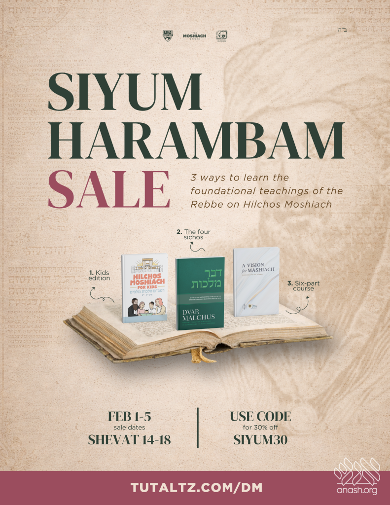 To mark this rare Siyum, a limited-time sale is making those teachings accessible to every Jew. From Sunday, 14 Shvat, through Thursday, 18 Shvat, three powerful resources are available at 30% off: